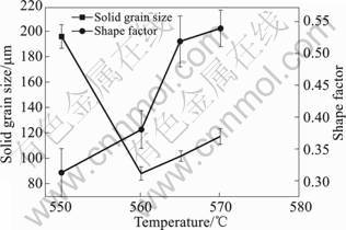Fig.5 Variation of grain size and shape factor with reheating temperature for as-cast AZ91D magnesium alloy during partial remelting