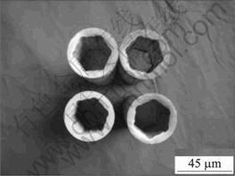 Fig.6 shows the thixoextruded spacing components. As shown in Fig.6, it is no problem for the reheated slugs to fill the die and the thixoformability of slugs in the semi-solid state is good. The mechanical properties of the AZ91D magnesium alloy produced by SSTT route are listed in Table 1. Meanwhile, the mechanical properties of AZ91D magnesium alloys produced by other processes and researchers are also listed for comparison[10]. The ultimate tensile strength of thixoextruded AZ91D magnesium alloy produced by the SSTT route is slightly higher than that of thixoforged AZ91D magnesium alloy produced by the strain induced melt activation (SIMA) route. The mechanical properties of the thixoforged AZ91D magnesium alloy produced by the new SIMA process (four-pass equal channel angular extrusion plus partial remelting) show a significant improvement over those of the alloy produced by SSTT route.
