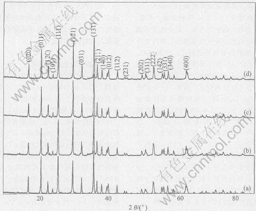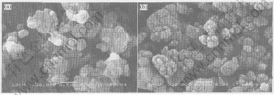 本研究采用的仪器为日本Rigaku D/max2550VB+18kW转靶X射线衍射仪。 物相分析的条件为: CuKα 辐射, 40kV, 300mA, 步宽 0.02°, 扫描速度 8°/min, 扫描范围(2θ)为10°~90°; 用JEOL公司的JSM-5600LV扫描电子显微在20kV下分别以不同的放大倍数对样品的表面形貌进行观察; 合成产物的含碳量由CS800高频红外碳硫仪(德国)来测定。