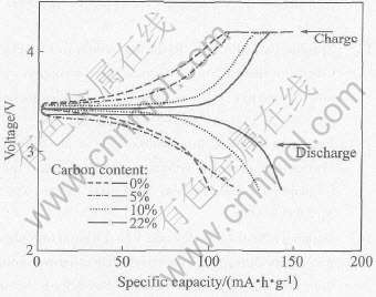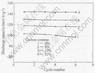 3) 随着碳掺碳量的增加, 样品的充放电容量有明显提高, 循环性能也有所改善。 其中, 含碳量22%的样品电化学性能最佳, 首次放电容量143.4mA·h/g, 经6次循环后放电容量仍达142.7mA·h/g, 容量衰减0.7%。