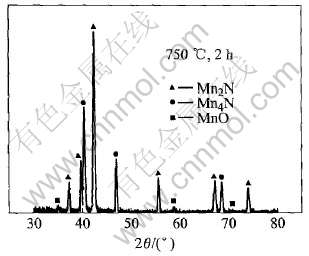 2) 以74μm锰粉为原料, 在750℃, 保温2h的条件下合成氮含量7.75%的氮化锰。