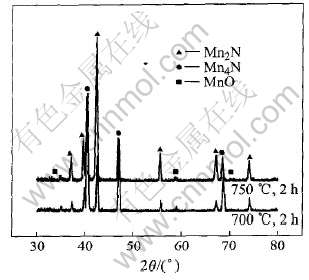 图5所示为样品分别在700℃和750℃下微波合成2h氮化锰产物的X射线衍射谱。 从图5中可明显看出, 700℃时合成的Mn2N比750℃时合成的Mn2N的衍射峰小, 检测氮含量也相对较少。