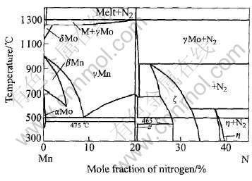 图8所示为Mn-N二元相图。 从图8中可以看出, 当氮含量为18%~20%(摩尔分数), 主要的相结构为Mn4N。 为了达到合成出氮含量为20%~30%(摩尔分数)的效果, 从Mn-N相图分析来看, 合成温度必须在930℃以下, 高于930℃, 合成的Mn2N是不稳定的, 合成过程中过量的氮气有利于氮化锰的合成; 当氮含量大于20%(摩尔分数)时,出现相结构Mn2N, 本研究显示的最佳微波合成温度为750℃。