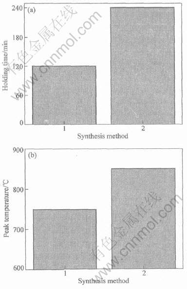 在微波合成效果(氮含量)达到或超过传统真空电阻炉合成工艺条件时, 微波工艺与传统工艺对比如图10所示。 从图10中可以明显看出, 氮化锰采用微波设备合成具有很明显的优势, 该技术填补了我国合成氮化锰技术的一项空白。 合成温度比传统的合成温度至少低100℃, 合成保温时间仅为传统工艺合成保温时间的1/2, 甚至更短, 充分发挥了微波合成的高效、 省时、 节能的特点, 有着广阔的工业应用前景。