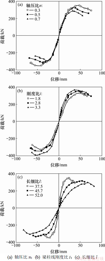 图2(a)所示为不同轴压比(n=0.3,0.5,0.7)下的框架P-△骨架关系曲线。从图2(a)可以看出:轴压比不仅影响结构的最大水平承载力,还较大地影响了曲线的形状;随着轴压比的增大,结构的强化段刚度变小,而且轴压比越大,下降幅度越明显。