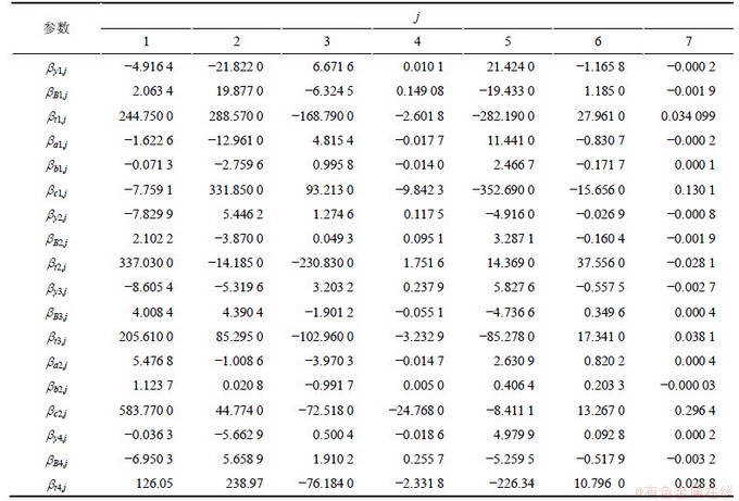 式中:△-为上一循环反向加载的最大挠度;△l+和△0-分别表示上一循环正向加载的最大挠度和这一循环反向卸载至零的残余挠度。式(9)中的各系数通过对试验数据进行回归分析(如图6所示),按式(10)和式(11)计算,多项式中的各系数b见表2。