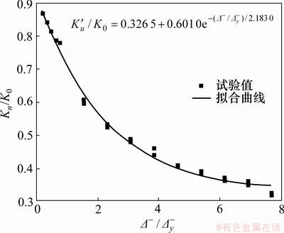(3) 4-5,9-10和16-17段:为屈服后正向卸载段,根据试验结果,这一段的卸载刚度Ku可以表示为初始加载刚度K0的函数(如式(12)),其拟合曲线如图7所示。