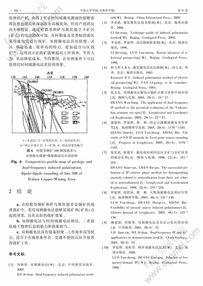 摘 要:以哈腊苏铜矿和萨乌斯坎德多金属矿为例,研究在阿勒泰山区运用双频激电法进行快速找矿评价的效果。研究结果表明:在交通不便、自然条件差的山区,双频激电法与时间域激电法相比具有轻便、快速等优点,找矿效果好,能够满足快速找矿评价的需要。