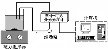 图2所示为在线分光光度系统。从图2可见:在线分光光度系统由反应装置、光学测量装置和记录装置3部分组成。反应装置包括磁力搅拌器和250 mL烧杯。测量装置包括紫外-可见分光光度计、蠕动泵和比色皿。废水在系统中的流动速度为22 mL/min。记录装置为计算机,在反应过程中其记录频率为12次/min。