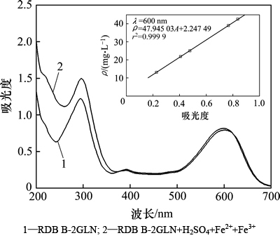 光谱范围有1个最大吸收峰(波长为600 nm)。在此最大吸收峰处且pH为中性时,RDB B-2GLN的质量浓度(ρ)和吸光度(A)的标准方程和标准曲线如图4所示(ρ=47.945 03A+2.247 49,r2=0.999 9)。在实验中通过计算机记录样品的即时吸光度,并根据标准方程将吸光度转化为染料质量浓度。从图4可见:当溶液中加入Fe2+,Fe3+和H2SO4时活性深蓝染料B-2GLN溶液的紫外-可见光谱有很大的改变。但是加入Fe2+,Fe3+和H2SO4的染料溶液的光谱在500~700 nm没有发生任何变化,这表明染料溶液的紫外-可见光谱在可见光范围内未受Fe2+,Fe3+和H2SO4影响。所以,本实验中,选择测定波长为600 nm,对Fenton氧化过程中染料溶液的氧化降解进行在线测定研究。