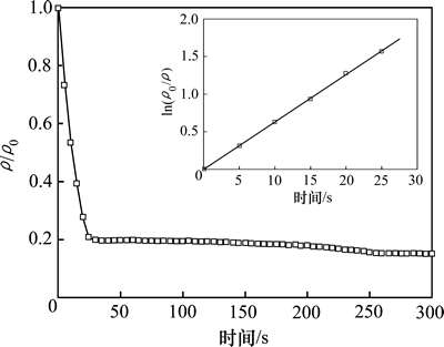 图5所示为染料的ρ/ρ0值随时间的变化规律(ρ(RDB B-2GLN)0=16 mg/L,c(Fe2+)0=0.069 6 mmol/L,c(H2O2)0=2.635 mmol/L,pH=2.7,θ=27 ℃)。ρ为伴随时间的即时染料质量浓度,ρ0为染料的初始质量浓度。处理活性深蓝染料B-2GLN废水,可以得出Fenton氧化过程分2个阶段进行:第1个阶段,降解速率非常的快;第2个阶段(t≥25 s),随着反应时间的延长脱色速率的增加明显放缓。这些实验现象可以从2个方面解释。首先,溶液中Fe2+和H2O2的量随着Fenton氧化过程的消耗而减少。其次,反应所产生的中间产物会降低染料降解的速率。Fenton氧化过程在第1阶段明显遵循一级动力学。ln(ρ0/ρ)=kapt。通过数据点的最佳拟合曲线的斜率代表一级速率常数。从图5可以看出:研究结果符合简单的一级动力学定律。