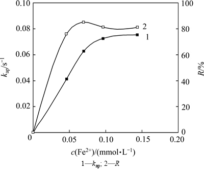 图6所示为在一系列不同初始浓度Fe2+的条件下染料的色度去除率和反应速率常数kap(ρ(RDBB-2GLN)0=16 mg/L,c(H2O2)0=2.635 mmol/L,pH=2.7,θ=27 ℃)。从图6可见:Fe2+的初始浓度从0.016 7 mmol/L到0.069 6 mmol/L时RDB B-2GLN的脱色率从33.19%增加至85.04%。但是当Fe2+的初始浓度继续增加时RDB B-2GLN的脱色率略有降低。这一实验现象表明高初始浓度的Fe2+并没有对Fenton氧化过程中RDB B-2GLN的脱色产生作用,这是由于Fe2+和染料分子对·OH的争夺[15]。因此选择0.069 6 mmol/L初始浓度的Fe2+作为反应的最佳剂量。当Fe2+的初始浓度从0.016 7 mmol/L到0.069 6 mmol/L时kap从0.014 43 s-1增至0.062 65 s-1。它表明Fe2+催化剂可以明显的促进H2O2的分解和·OH的产生。