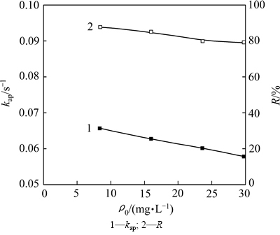 染料初始质量浓度对色度去除率和反应速率常数的影响如图9所示(c(Fe2+)0=0.069 6 mmol/L,c(H2O2)0= 2.635 mmol/L,pH=2.7,θ=27 ℃)。从图9可以看到:当染料的初始质量浓度从8.4 mg/L变化至29.8 mg/L时,RDB B-2GLN染料的色度去除率和反应速率常数(kap)相应略有降低;随着染料溶液初始质量浓度的升高,水中的染料分子的数量相应增加,由于溶液中·OH的数量没有变化,色度去除率和反应速率常数(kap)降低。