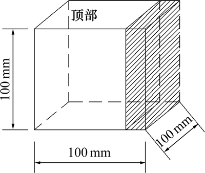 采用标准试验方法制作各种粉煤灰掺量的混凝土立方体试块100 mm×100 mm×100 mm若干,标准养护至30 d左右后取出,用砂轮进行切割,假设立方体试块浇筑面为上面,则从试块侧立面切割得到切片,并加工成厚约为15 mm的切片(图1)。在切割过程中用浇水方法对砂轮进行降温,并用砂轮将切片切面磨平。每类配合比混凝土得到的切片不少于10片。试验过程如下:1) 将试件切片再标准养护至90 d左右后,放入水中浸泡若干天后称其饱水质量Gw。浸泡时间按以下方法确定:每周用精度为0.1 mg的电子分析天平测定试块质量1次,当2次测定质量差不超过±1‰时,认为混凝土已处于完全饱水状态;2) 将饱水切片放入105 ℃的烘箱中烘干,称取干质量Gg,烘干时间的确定方法与上相同;3) 将烘干的混凝土切片放入设定好温湿度的SN-90氙灯耐气候试验箱内,该仪器主要是通过控制箱内温湿度来模拟外界环境,又称人工气候箱,温度范围为0~70 ℃,湿度范围为50%~98%。当混凝土含水率与环境相对湿度达到平衡时,称取该温度、相对湿度组合下试块的质量Gi。这里混凝土微环境与环境相对温湿度达到平衡的确定方法同上。根据式(6)计算各温湿度控制下对应孔隙水饱和度S: