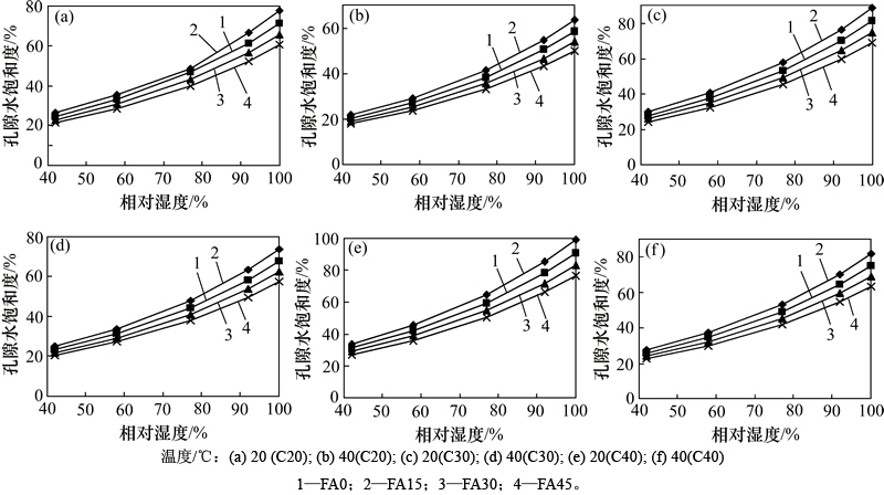 2) 在混凝土微环境相对湿度一定时,随着温度升高,混凝土内孔隙饱和水蒸汽压增大,水蒸汽压必然随饱和水蒸汽压的增大而增大,这导致混凝土内将有更多的水分以气态水的形式存在于混凝土孔隙中,液态水含量减小,导致孔隙水饱和度减小。