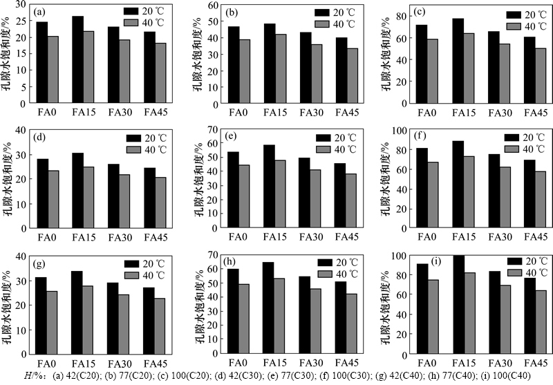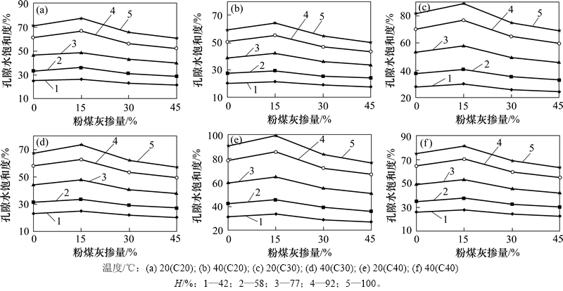 在恒定混凝土微环境温湿度条件下,粉煤灰掺量对C20,C30,C40粉煤灰混凝孔隙水饱和度的影响规律如图4所示。从图4可知:在混凝土内微环境相对温湿度恒定情况下,当粉煤灰掺量不超过15%时,混凝土内孔隙水饱和度随粉煤灰掺量的增加而增大;当粉煤灰掺量超过15%时,混凝土内孔隙水饱和度随粉煤灰掺量的增大而降低。如图4(c)中C30混凝土,控制混凝土微环境温湿度为20 ℃,H=92%,粉煤灰掺量为15%时混凝土孔隙水饱和度分别较基准混凝土增大了8.8%,而粉煤灰掺量为30%和45%时混凝土孔隙水饱和度较基准混凝土分别下降了8.0%和15.1%。这是由于15%粉煤灰掺量使混凝土有害孔及多害孔(孔径>50 nm的孔)的分孔隙率略有增大,30%和45%粉煤灰掺量使混凝土总孔隙率、有害孔及多害孔的分孔隙率明显增大[15],即粉煤灰掺量提高使混凝土总孔隙率或孔隙孔径增大,混凝土孔隙内越不容易发生毛细管凝聚现象,导致混凝土内孔隙水饱和度减小。