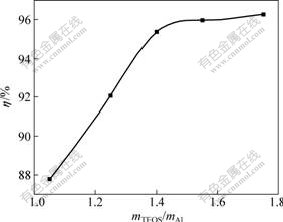 当TEOS用量仅为1.05时,析氢量较大,缓蚀效率较低。这是因为水解-缩聚生成的SiO2过少,不能完全包覆片状铝粉表面,仅仅生成疏松的SiO2膜层,不能对片状铝粉起到较好的保护作用。随着TEOS用量的增加,缓蚀效率也随之增大。在TEOS用量超过1.4以后,缓蚀效率提高幅度不大。这是因为片状铝粉已被SiO2充分包覆,过量的SiO2仅使包覆层增厚,对缓蚀效率的影响较小。