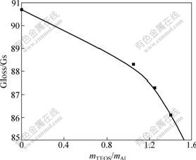 在水、乙二胺和片状铝粉的质量比为36?0.75?1,反应温度40 ℃,反应时间6 h的条件下,考察TEOS用量(以mTEOS/mAl计)对水性铝粉缓蚀效率(见图1)与涂膜光泽度(见图2) 的影响。