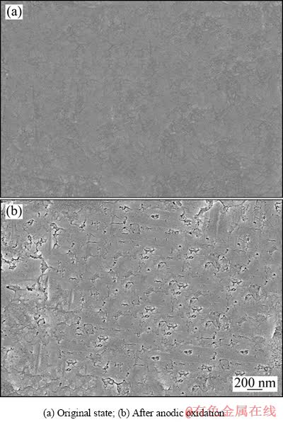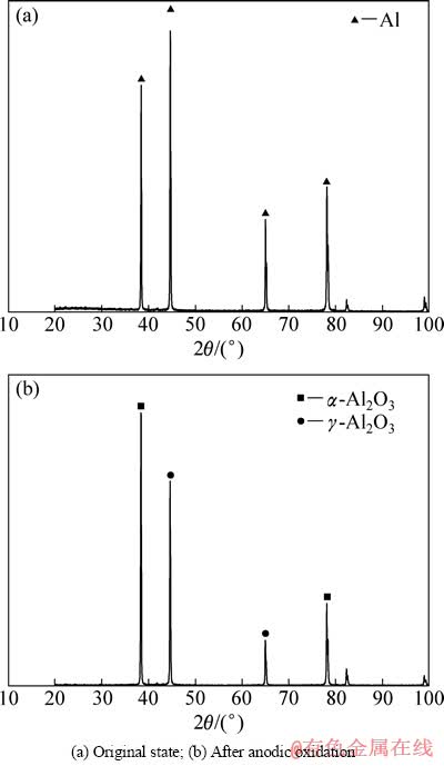 1) 阳极氧化膜由Al和O原子组成,生成的氧化膜组成物相为稳相α-Al2O3和亚稳相γ-Al2O3。