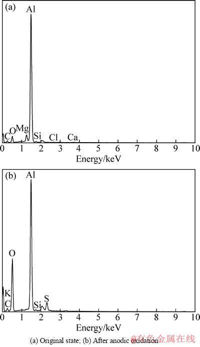 原始状态铝合金表面EDS分析结果如图2(a)所示,Al原子的峰线很强,说明Al原子是铝合金的主要组成成分。同时EDS还显示了O原子的的能谱线,这说明原始状态表面也含有O原子,这是在空气中铝合金自然氧化的缘故。其表面化学成分如下:Al 51.57、O 21.10、C 23.79、Mg 2.70、Si 0.46、Ca 0.39(质量分数,%);Al 35.74、O 24.65、C 37.04、Mg 2.07、Si 0.30、Ca 0.19(摩尔分数,%)。阳极氧化后表面EDS分析结果如图2(b)所示,Al和O原子的峰线较强,说明Al和O原子是氧化膜的主要组成成分。其化学成分:Al 28.80、O 56.62、C11.08、Si 0.18、S 3.15、K 0.17(质量分数,%);Al 18.93、O 62.77、C 16.36、Si 0.11、S 1.74、K0.08(摩尔分数,%)。氧化膜中O和Al原子的质量分数之和为85.42%,这表明氧化膜是以O和Al为主要组成成分。阳极氧化膜表面的EDS分析未发现Cu原子,这可能是在抛光过程中铝合金表面Cu原子被化学溶解的缘故[12]。此外,阳极氧化膜表面还含有C、K和S原子,其主要来源于阳极氧化的电解液和电解液中杂质。