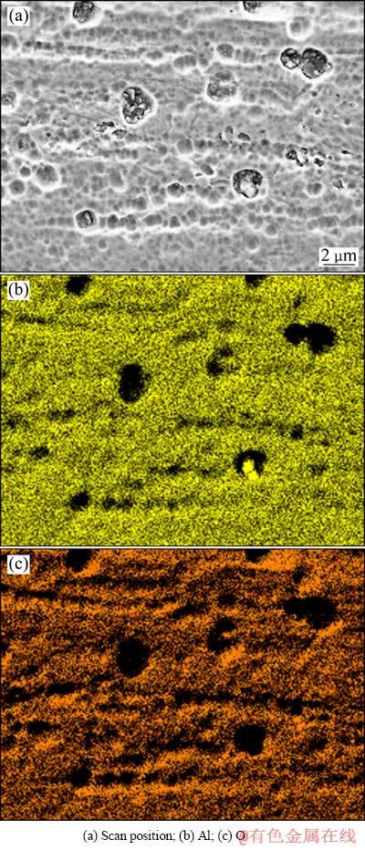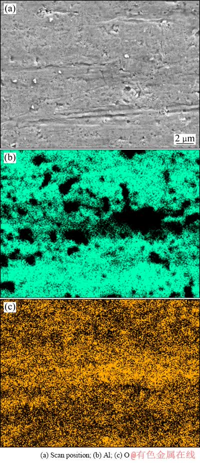 氧化膜表面面扫描位置如图5(a)所示,阳极氧化膜表面分布着许多明显的圆形坑洞,可能是被H2SO4电解液溶解所致,另一个原因是部分杂质因溶解与氧化膜剥落。如图5(b)和(c)所示,Al原子和O原子在氧化膜表面含量较高,且Al与O原子在面上分布存在对应关系。氧化膜表面出现了局部发黑和发暗的现象,主要是氧化膜中出现空洞和杂质所致。图5所示为阳极氧化后铝合金表面的中间部位膜层较薄,存在缺陷,氧化膜容易在缺陷边缘尖角处发生开裂现象。同时,氧化膜厚度不均匀,这样削弱了氧化膜对基体的保护作用。