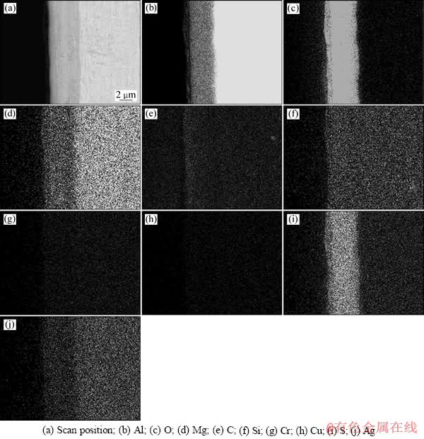 阳极氧化后界面的面扫描位置如图7(a)所示,阳极氧化膜厚度约为6 μm。对图7(a)中结合界面进行面扫描分析,Al的峰线很强,说明Al原子是界面的主要成分。其化学成分如下:Al 44.15、O 27.38、Mg 0.36、C 26.51、Si 0.19、S 0.85、Cr 0.05、Cu 0.23、Ag 0.28(质量分数,%)。Al 29.17、O 30.51、Mg 0.26、C 39.34、Si 0.12、S 0.47、Cr 0.02、Cu 0.06、Ag 0.05(摩尔分数,%)。如图7(b)和(c)所示,Al和O出现了明显分层富集现象,Al主要分布在基体中,O主要分布在氧化膜中。氧化膜层是由疏松层和致密层组成,外层是疏松层,Al和O的含量较低;内层是致密层,Al和O的含量较高。Al和O主要分布在氧化膜中,这有助于提高铝合金表面的显微硬度、耐蚀性和耐磨性。如图7(d)所示,Mg也出现了富集现象,可以降低界面的张力,同时也会使Al2O3变成低价态氧化物,降低其致密性。如图7(e)~(h)所示,C、Si、Cr和Cu等浓度在氧化膜和基体中基本保持不变,其中Si和Cu为基体中原有的元素,C和Cr则来自于阳极氧化溶液中反应的化学元素。S和Ag在氧化膜中出现了富集现象,如图7(i)和(j)所示,其主要来源于阳极氧化时H2SO4溶液中。