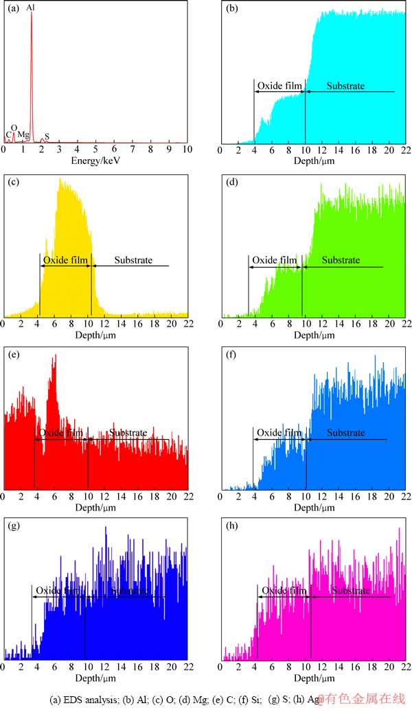 对图7(a)中结合界面进行线扫描分析,其化学成分如下:Al 42.04、O 27.33、Mg 0.35、C 28.99、Si 0.18、S 0.84、Ag 0.27(质量分数,%);Al 27.19、O 29.82、Mg 0.25、C 42.12、Si 0.11、S 0.46、Ag 0.04(摩尔分数,%),如图8(a)所示。EDS能谱分析表明:界面Al的峰线很强,说明Al是界面的主要组成成分。还存在少许C、O、Mg和S,不含Si和Ag,说明其中微量的Ag等杂质在EDS下测不出来。界面区域可分为突变型、化合物型和扩散型3种[13-14]。如图8(b)和(c)所示,阳极氧化膜和基体有明显的分界,基体中Al浓度远高于O浓度,基体中Al浓度含量很高,且趋于稳定。阳极氧化膜中,Al浓度低于基体中的,O浓度高于基体中O浓度。由界面沿膜层向外,Al浓度出现了下降的趋势,而O浓度出现了上升的趋势。基体中Al由基体向膜层扩散,膜层中O由膜层表面向基体扩散。在结合界面处形成的是Al2O3化合物,此时界面为化合物型,同时阳极氧化膜Al2O3溶解基体中Al原子,形成扩散界面,这表明阳极氧化膜结合界面是化合物型+扩散型形式,由Al—O化学键提供结合力[15-16]。如图8(d)所示,基体里的Mg含量高于膜层的,由界面沿膜层向外,Mg浓度出现了下降的趋势;Mg也由基体向膜层发生了扩散。如图8(e)所示,C原子均匀地分布在氧化膜和基体中,在界面处过渡比较平缓,氧化膜中C原子浓度略高于基体中的浓度,为阳极氧化过程中参加反应的化学元素。而Si在氧化膜中的浓度略低于基体的,如图8(f)所示,为基体中原有的化学元素。如图8(g)~ (h)所示,S和Ag等为阳极氧化过程中掺入氧化膜中溶质离子。