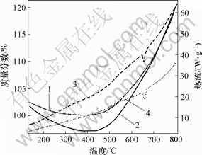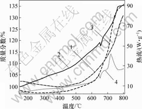热分析采用德国生产的NETZSCH STA 449C型综合同步热分析仪(DSC-TG),分别以纯度为99.99%氮气和氩气作流动载气,流速为20 mL/min。样品用量为2 mg左右,用Al2O3坩埚装样。升温速率为20 ℃/min,最高测试温度为800 ℃。