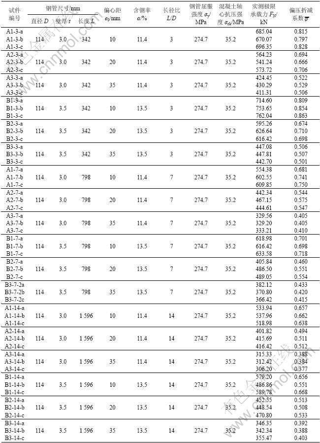 土木工程结构朝着高耸、大跨、重载的方向发展,恒载在结构的受力中占有较大比例。同时,高层建筑、大跨度桥梁、海洋工程等大型工程对材料性能的要求也越来越高。钢管混凝土中的核心混凝土可以延缓钢管的屈曲,而外包钢管使混凝土处于三向受压状态能增强其抗压性能,其组合力学性能超过了两者的叠加,充分利用了钢材的受拉和混凝土的受压特性。国内外学者对钢管混凝土构件的力学性能进行了大量的研究,已经形成了比较完善的理论体系[1-4]。轻集料混凝土密度较普通混凝土低20%~30%,故钢管轻集料混凝土密度要比钢管普通混凝土密度小,适应了现代材料轻质高强的发展需求。已有研究表明[5-9]:钢管轻集料混凝土同样具有优异的力学性能。尽管日本已有将钢管轻集料混凝土应用于“新干线”(高速铁路桥梁)的工程实例[10],但对其性能的研究还未系统地开展。由于钢管混凝土本身的特性,通常用于受压构件。受材料的初始缺陷、材料不均匀性以及制造偏差等因素的影响,轴心受压状态很难实现。在外部横向力作用下,往往也使构件处于偏心受压状态[11]。本文作者在轴压和受弯研究的基础上,分析54根钢管轻集料混凝土偏压柱的试验结果,对偏心受压状态下钢管轻集料混凝土的承载力进行研究。
