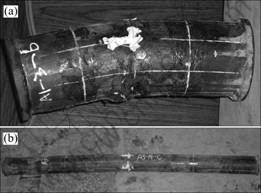 本次试验试件在偏心受压下的破坏形态可以分为以下2种情况:对于长径比较小(L/D=3,其中,L为试件长度,D为试件直径)的短柱偏压试件,试件破坏时发生侧向挠曲,中截面发生明显的局部屈曲(图2(a)),试件有较明显的强度破坏特征;对长径比较大的中长柱试件(L/D=7或14),试件发生较大的侧向挠曲,钢管表面无明显屈曲,试件失稳破坏特征明显(图2(b))。根据中截面纵向应变分布,试件截面变形基本符合平截面假定[12]。