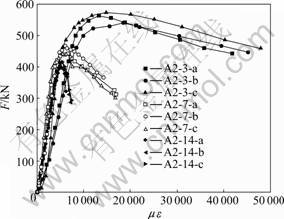 图3所示为荷载-整体纵向应变曲线。在加载初期,荷载-纵向应变曲线基本上为直线,试件处于弹性阶段加载至比例极限后,曲线明显偏离其初始的直线,进入弹塑性工作阶段。当荷载接近极限荷载时,荷载的增长速度变慢,而纵向应变的增长速度加快。