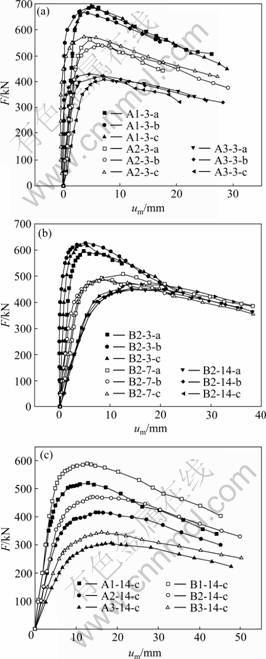 图4所示为各组试件在不同偏心率、不同长径比、不同含钢率下的荷载(F)-L/2处横向挠度(um)对比曲线。由图4(a)可见:在同一组试件中,偏心率越小,则荷载-L/2处横向挠度曲线的初始斜率越大,极限承载力也越大;到达极限荷载后下降也越快。偏心率越大,构件所受到的弯矩越大,从而导致承载力降低。