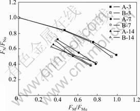 偏心受压加载相当于压弯构件的比例加载,可以采用构件FN/FNu-FM/FMu的及相关性曲线来考虑偏心受压构件的计算方法。在偏心率较小的情况下,FN/FNu-FM/FMu相关性曲线可以近似为1条直线[1-2]。图5所示为FN/FNu-FM/FMu相关性曲线。由图5可知:对于偏心较小的情况,其曲线变化趋势可近似简化为线性关系。当FM/FMu=0时,FN/φFNu=1。故可用下式来计算小偏心率压弯构件承载力: