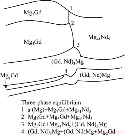 3) Four tri-phase equilibria were confirmed, α(Mg)+ Mg7Gd+Mg41Nd5, Mg7Gd+Mg5Gd+Mg41Nd5, Mg5Gd+ Mg41Nd5+(Gd,Nd)3Mg and (Gd,Nd)3Mg+(Gd,Nd)Mg+ Mg2Gd.