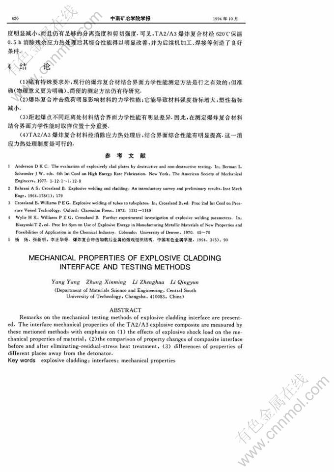 Key words:explosive cladding; interfaces; mechanical properties