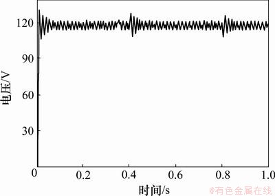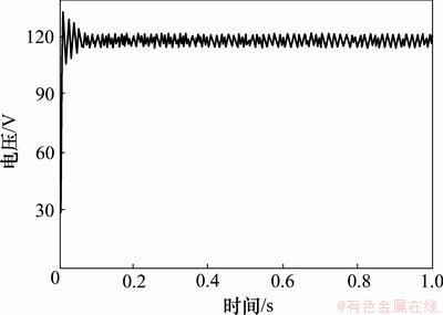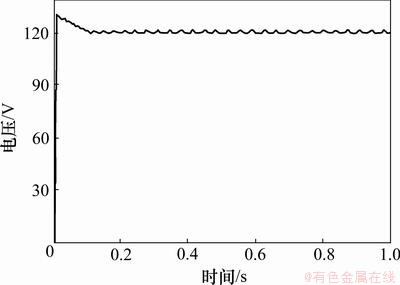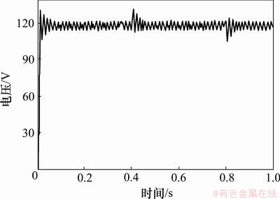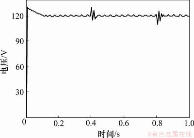 针对T-S模糊控制算法,利用MATLAB仿真软件进行仿真实验,并与常规PI控制仿真结果进行比较。仿真中的主要参数如下:交流输入电压Uin=380 V,电压频率为50 Hz。设定直流输出电压为120 V,输入电感Li=3.6 mH,输入电容Ci=1 290 μF,输出电感Lf=64 μH,输出电容Cf=2 200 μF,变压比n:1=3:1,漏感Lk=8 μH,负载电阻RL=100Ω,t=0~1 s。当对系统施加阶跃噪声扰动时,不同控制下的输出电压波形见图5和图6。