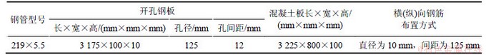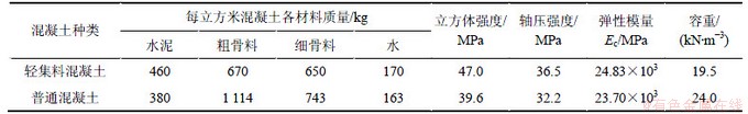 试验中,混凝土板采用普通混凝土浇筑,钢管中填充轻集料混凝土。为测得混凝土的抗压强度及弹性模量,各制作1组150 mm×150 mm×150 mm的立方体试块及1组150 mm×150 mm×300 mm的棱柱体试块,室内浇水养护28 d。混凝土的配合比及相应力学参数见表1。试验采用Q235直缝钢管,钢材的强度及弹性模量由拉伸试验确定,按《金属材料室温拉伸试验方法》[8](GB/T 228—2002)的要求进行,得到钢材的屈服强度fy=300.7 MPa,弹性模量Es=1.95×1011 Pa。
