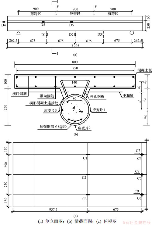 试验在河海大学土木与交通试验中心结构工程实验室进行。组合梁纯弯试验采用三分点加载方式,通过主分配梁直接作用于放置在混凝土板上的钢梁上,机械千斤顶手动加载。荷载由压力传感器测量,应变及宏观变形分别由电阻应变片和电测位移计测量。如图1(a)所示:在组合梁弯曲平面内的中点及四分点处布置3个电测位移计D1-3以测定组合梁的竖向挠曲,在组合梁锲形混凝土连接处沿长度方向布置3个电测位移计D4-6以测定组合梁的相对滑移。混凝土板及钢管上的电阻应变片的具体布置如图1(b)和(c)所示,混凝土板上的应变片用C表示,钢管上沿长度方向四分点及中点处布置纵向和环向应变片。