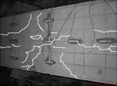 随着作用于试件上的荷载不断增大,试件的挠曲变形不断增加,混凝土板表面的裂缝逐渐开展。当荷载不再增大,而试件变形继续增加时,认为作用于试件上的荷载已达到极限荷载。