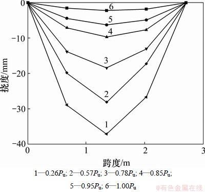 图5所示为试件在荷载作用平面内挠度沿构件长度方向的分布曲线。从图5可以看出:随着荷载的增大,试件的挠度沿着中点对称逐渐增大,其挠曲线形状与正弦半波基本吻合;开孔钢板在传递剪力的同时,有效地抵抗了混凝土板的掀起;当作用于组合梁上的荷载达到极限荷载时,钢管轻集料混凝土梁与混凝土板的弯曲曲率仍可以基本保持一致。