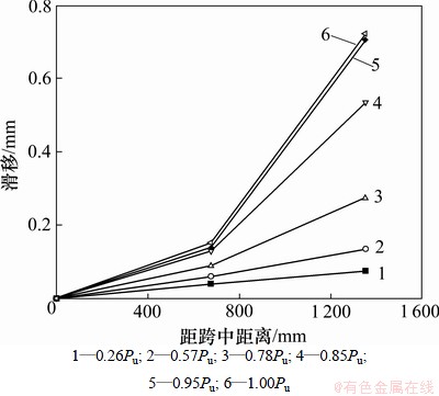 图7所示为试件的相对滑移曲线。从图7可见:在荷载加载初期,试件处于弹性状态,剪跨区内各点相对滑移量和该点与纯弯段的距离成正比,四分点处的相对滑移量大约为梁端的一半;同时,在整个加载过程中,随着荷载的增大,由于混凝土板开裂等,试件梁端的滑移量增加明显,最大滑移量约为0.7 mm;在试件被破坏时,其相对滑移量很小,开孔钢板呈现出较强的抗剪强度,作为剪力连接件保证了钢管轻集料混凝土梁与混凝土板的协调变形。