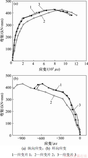 图8(a)所示为钢管跨中截面纵向应变分布图,可见:纵向应变曲线均存在明显的屈服点;当荷载达到极限荷载70%左右时,钢管底部开始屈服,其余部分仍处于弹性状态,限制试件变形的发展;随着荷载的增大,钢管的屈服范围向上发展;当荷载约为极限荷载80%时,钢管中部开始屈服;当试件达到极限荷载时,纵向应变已经充分发展,试件为典型的延性破坏。图8(b)所示为钢管跨中截面环向应变曲线,均为压应变。这说明轻集料混凝土始终处于环向受压状态,钢管的存在有效约束了轻集料混凝土的变形开裂。