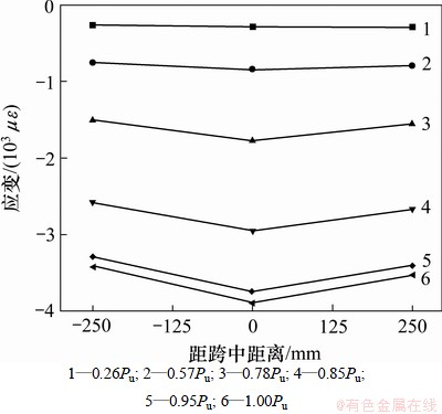 图6所示为试件跨中截面沿高度方向的纵向应变曲线。从图6可见:在各个荷载阶段,试件截面应变分布基本符合平截面假定;在加载初期,试件截面处于弹性阶段,拉压区应变增加速度一致;随着荷载增大,钢管受拉区先于混凝土板进入弹塑性阶段,中和轴向受压区偏移,最终位于混凝土板下层钢筋的上侧。