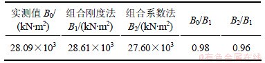 抗弯刚度实测值与按2种理论方法计算得到的抗弯刚度如表3所示。从表3可见:组合刚度法计算值B1与实测值B0及组合系数法抗弯刚度计算值B2接近,相结误差在5%以内。说明不考虑相对滑移引起的折减,运用组合刚度法计算组合梁的抗弯刚度是正确的。在实际工程中,采用组合刚度法预估组合梁的抗弯刚度更方便,具有一定的应用价值。