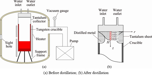 The schematic of distillation equipment is shown in Fig. 1. The metallic terbium was placed into a tungsten crucible (115 mm in external diameter, 95 mm in inner diameter and 225 mm in height), and a soaking temperature of 1850 °C was maintained for 30 h under a pressure of 10-5 Pa, and the temperature of crucible was measured by an infrared radiation thermometer (RATMR1SBSF, Reytek, USA) through the sight hole in the furnace, as seen in Fig. 1(a). Metallic vapor condenses on the inner surface of a cooled collector (tantalum sheet, with thickness of 0.1 mm), leaving high melting point and low vapour pressure impurities at the bottom of the crucible, where H is the thickness of the distilled metal (equal to 55 mm in the present experiment), while r and z are the cylindrical coordinates.