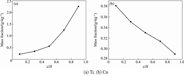 When the distillation experiment was finished, five samples were taken successively along the axial line in the distilled metal and the mass fractions of impurities determined are plotted in Fig. 2. For Ti, in the initial stage of the distillation experiment (Sample 1 in Fig. 1(b)), the mass fraction of Ti in the distilled metal is 220 mg/kg. As the distillation process continues, the mass fraction of Ti increases to 336, 560, 1245 mg/kg, and in the last stage of distillation, the mass fraction of Ti increases to 2260 mg/kg. It was found that in the initial stage, the impurity mass fraction is low, increases slowly, and in the last stage of the experiment, the impurity mass fraction increases rapidly, and the mass fraction of Ti in distilled metal increases exponentialy. For Cu impurity, the mass fraction profile is quite different from Ti, as it decreases linearly during the distillation process. In the initial distillation stage, the mass fraction of Cu is 380 mg/kg, gradually decreasing to 350 mg/kg, 330 mg/kg, 314 mg/kg, and in the last stage of distillation, the mass fraction of Cu decreases to 290 mg/kg, as seen in Fig. 2(b).