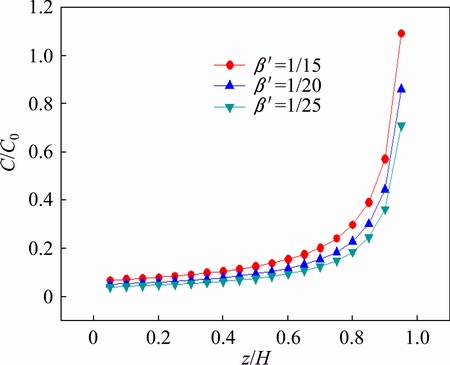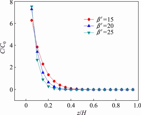 When the modified separation coefficient β′>1, the impurity mass fraction in the distilled metal calculated by Eq. (3) is shown in Fig. 6. In the initial stage of the distillation purification process, the mass fraction of impurity in the distilled metal is very high but decreases sharply and when z/H is about 0.4, the impurity mass fraction decreases to zero.
