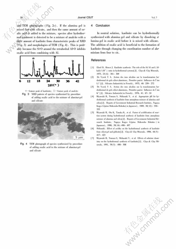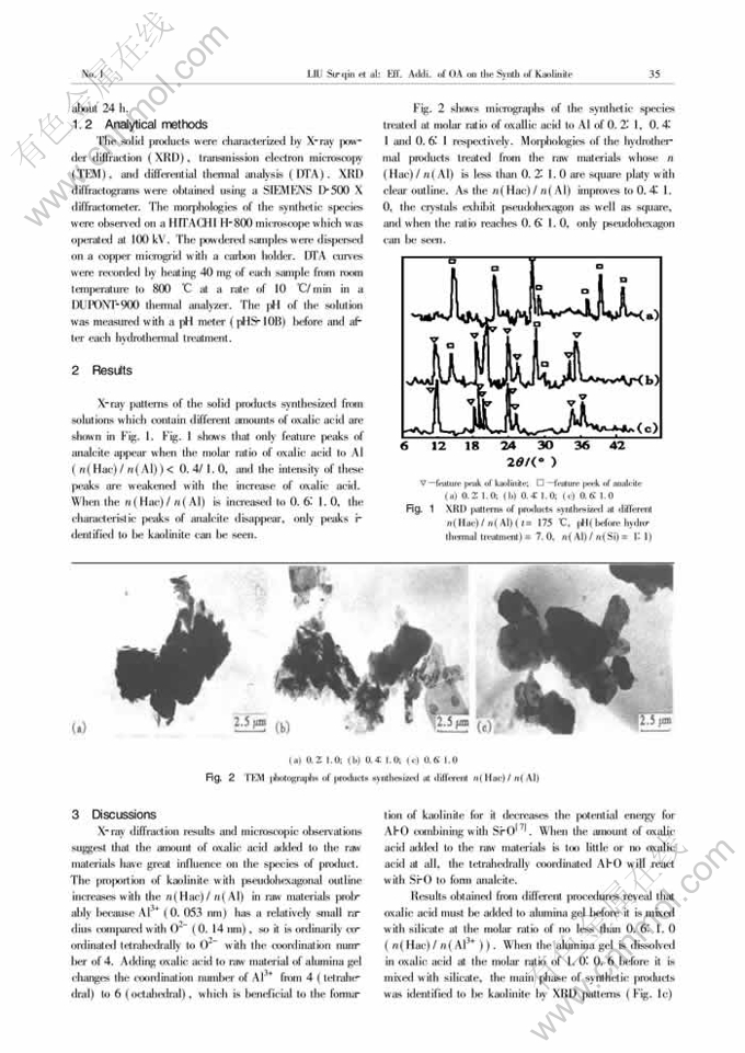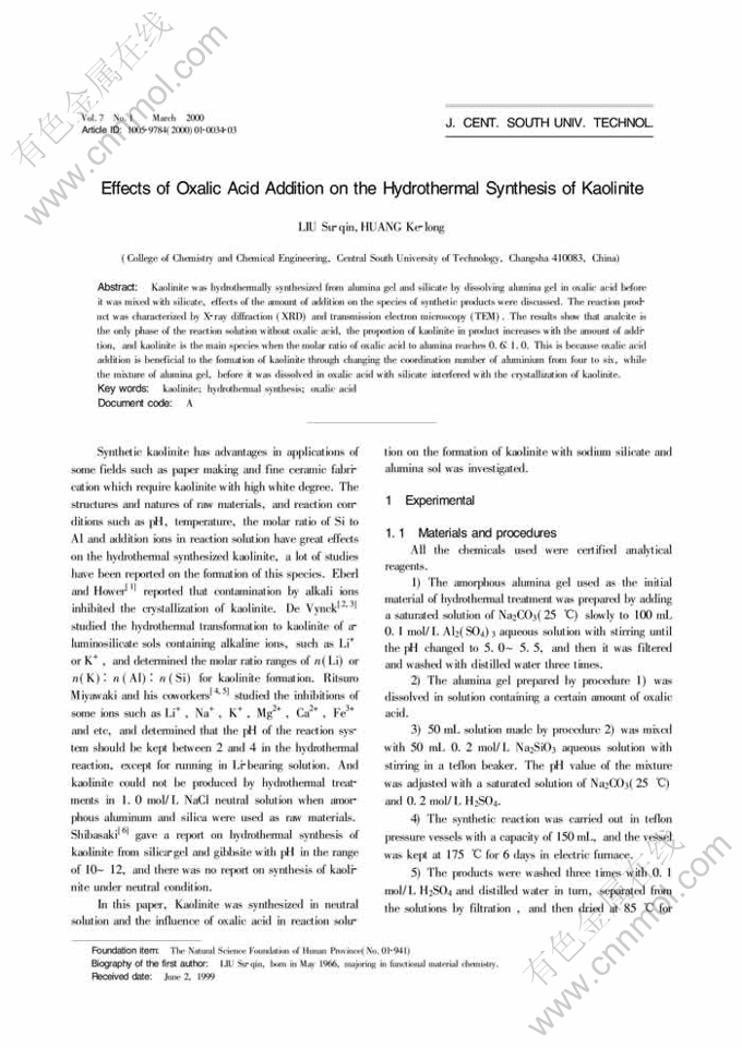 Key words:kaolinite; hydrothermal synthesis; oxalic acid