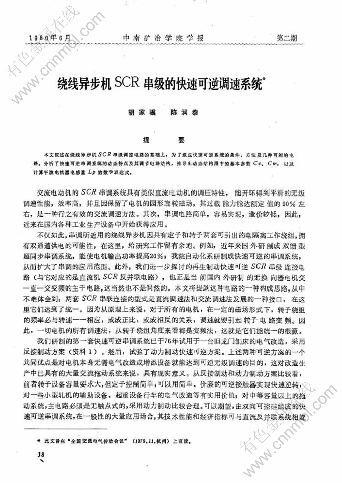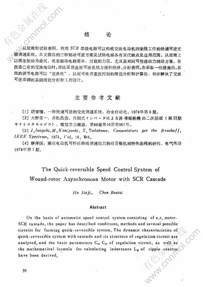 Abstract: On the basis of automatic speed control system consisting of a.c.motor-SCR cascade,the paper has described conditions,methods and several possiblecircuits for forming quick-reversible system.The dynamic characteristics ofquick-reversible system with cascade and its structure of regulation circuit areanalyzed,and the basic parameters Ce,C_M of regulation circuit,as well asthe mathematical formula for calculating inductance Lp of ripple reactorhave been derived.