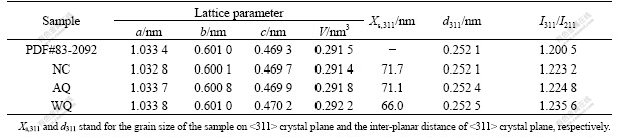 The XRD data in Table 1 can also reflect the same information. The grain size of sample under WQ at (311) crystal plane is 66.0 nm, which is smaller than those of the sample under NC (71.7 nm) and sample under AQ (71.1 nm). The sample WQ has larger peak intensity ratio (I311/I211) of 1.235 6. The lattice parameters are a=1.033 4 nm, b=0.601 2 nm, c=0.470 2 nm and V=0.292 2 nm3, which are larger than the corresponding parameters of samples under NC and AQ.